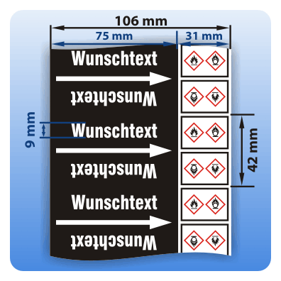 Nach der EU-Richtlinie 92/58 müssen alle Rohrleitungen für gefährliche Stoffe (gemäß Gefahrstoffverordnung §23) deutlich gekennzeichnet sein. Dafür muss neben den Texten zusätzlich die vorgeschriebenen Gefahrstoffsymbole abgebildet werden.
