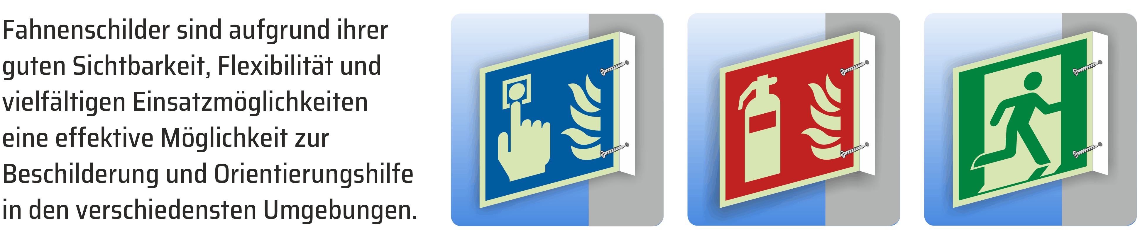 Durch ihre in den Raum hineinragende Bauweise sind sie besonders für lange Flure oder unübersichtliche Gänge geeignet. Rettungs- und Brandschutzzeichen als Fahnenschilder gewährleisten aus allen Richtungen und Blickwinkeln eine hervorragende Orientierung in Gefahrensituationen.